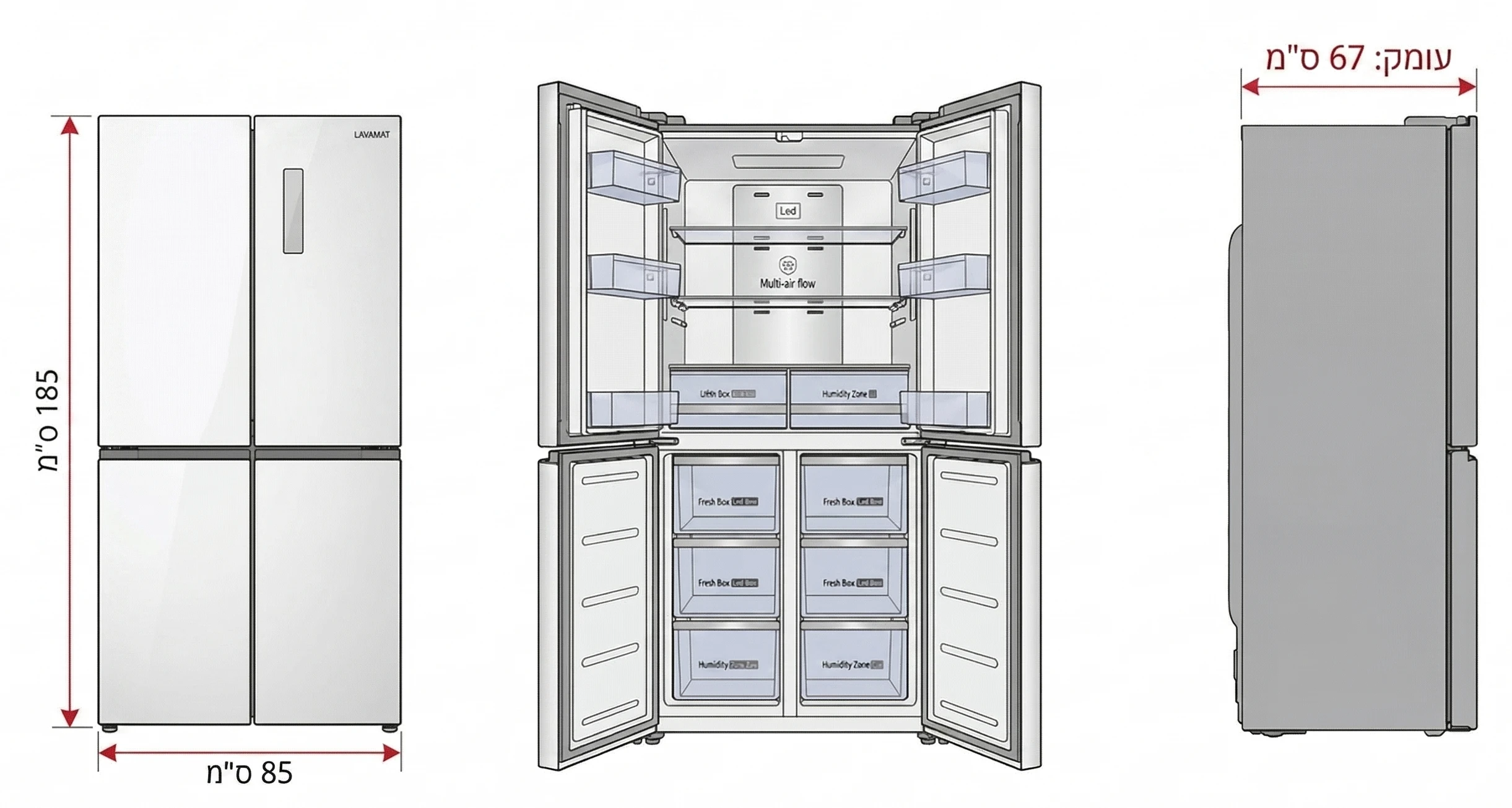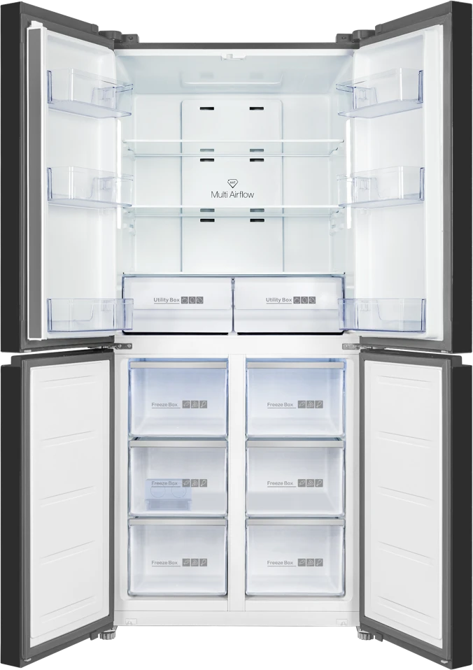 מקרר ארבע דלתות בנפח 470 ליטר עם No Frost ומערכת Multi Air Flow. כולל פיקוד אלקטרוני, תאורת LED, מגירות לחות ומערכת אחסון רחבה.