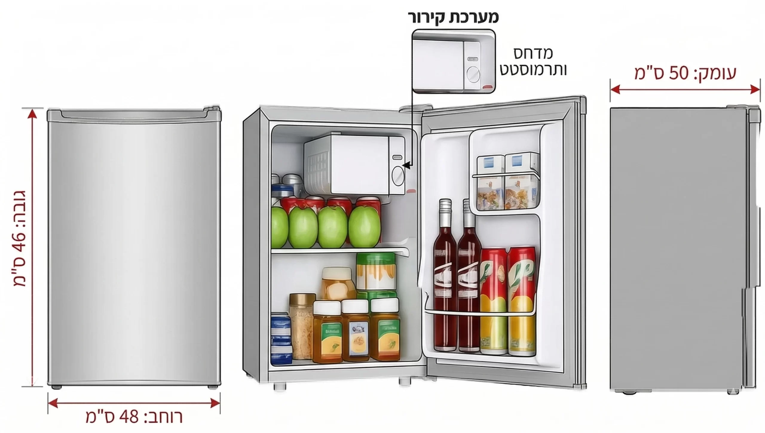 מקרר מיני בר בנפח 46 ליטר עם קירור סטטי ותרמוסטט מתכוונן בטווח 0–10 מעלות. מתאים לשימוש ביתי או משרדי, כולל תא הקפאה פנימי ואחסון בסיסי נוח.